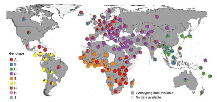 图,世界HBV基因型分布,中国主要以BCD基因型为主